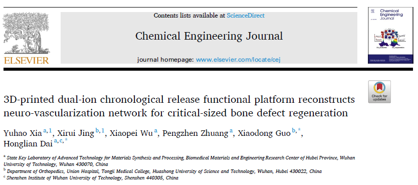 Xia Y, Jing X, Wu X, et al. 3D-printed dual-ion chronological release functional platform reconstructs neuro-vascularization network for critical-sized bone defect regeneration[J]. Chemical Engineering Journal, 2023, 465: 143015.