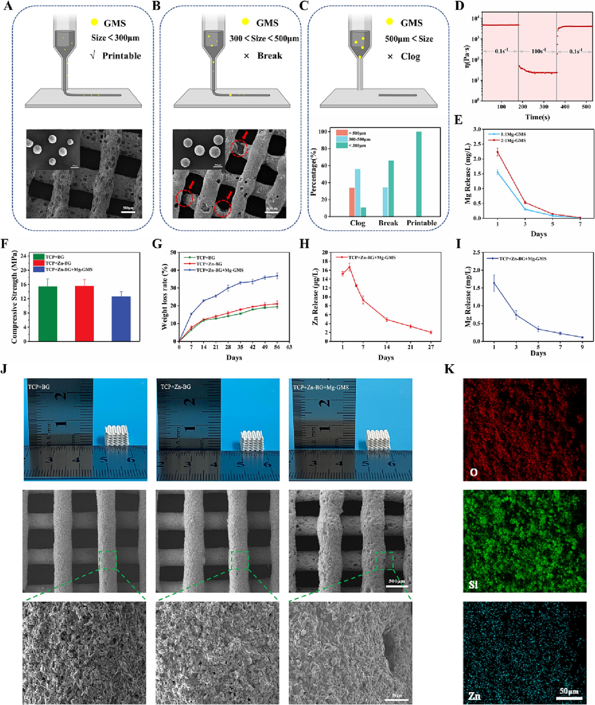 圖2. 3D打印雙離子時序釋放支架的表征。(A - C)不同粒徑Mg-GMS的TCP/Mg-GMS打印墨水的打印性測試。(D)TCP/Mg-GMS打印墨水的流變測試。(E)不同復合比例下的Mg2+釋放動力學。(F)復合支架的抗壓強度和(G)失重率。TCP/Zn-BG/Mg-GMS支架中Mg2+ (H) 和Zn2+ (I) 的釋放動力學。(J)TCP/BG、TCP/Zn-BG和TCP/Zn-BG/Mg-GMS支架的SEM圖像。(K)TCP/Zn-BG支架的EDS圖譜。