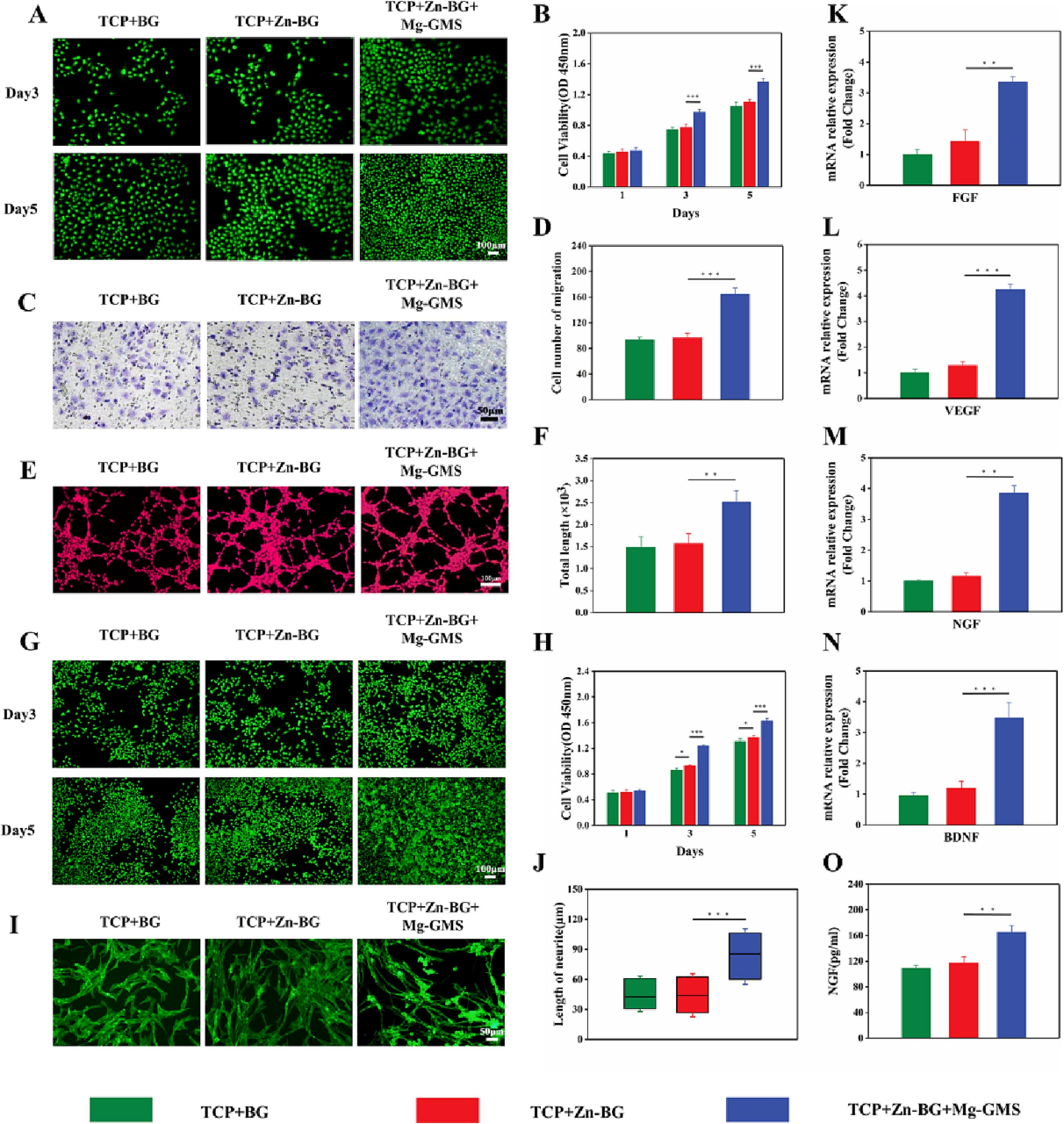 骨組織中的血管網絡為成骨提供了必需的營養、氧氣和生長因子。因此,血管化對于支架的再生性能至關重要。接下來,研究檢查了復合支架的血管生成能力。活/死細胞染色和CCK-8試驗的結果顯示,與其他兩組相比,TCP/Zn-BG/Mg-GMS中的HUVECs細胞活力和增殖顯著增加。Transwell試驗用于測試HUVECs的遷移能力。TCP/Zn-BG/Mg-GMS中的遷移HUVECs數量顯著高于其他兩組。管狀形成試驗用于評估HUVECs的血管化過程。在TCP/Zn-BG/Mg-GMS中觀察到較大的管狀結構,與TCP/BG和TCP/Zn-BG形成鮮明對比,表明Mg2+從復合支架中釋放后具有優異的血管生成活性。分支總長度的結果清楚地表明,TCP/Zn-BG/Mg-GMS中的計算參數遠高于其他兩組。這些結果進一步證實了TCP/Zn-BG/Mg-GMS對血管生長具有更好的誘導效果。總之,TCP/Zn-BG/Mg-GMS復合支架對血管網絡的重建起到了積極作用。神經發生對于骨修復也至關重要。我們通過使用雪旺細胞(SCs)的活/死細胞染色和CCK-8試驗,評估了三種復合支架的細胞相容性。結果顯示,TCP/Zn-BG/Mg-GMS中的SCs數量顯著高于其他兩組。神經生長因子(NGF)和腦源性神經營養因子(BDNF)是調節神經生長的重要介質。RT-PCR分析用于評估這兩種因子的表達。結果顯示,與其他兩組相比,TCP/Zn-BG/Mg-GMS表現出最高的基因表達。ELISA用于測定三組復合支架上種植的SCs的NGF分泌水平。結果顯示,TCP/Zn-BG/Mg-GMS中的NGF分泌水平顯著高于其他兩組,表明Mg2+有利于神經修復。軸突萌發是外周神經再生的關鍵決定因素。因此,使用PC12細胞研究復合支架的軸突萌發能力,以評估神經再生能力。結果顯示,TCP/BG和TCP/Zn-BG之間沒有顯著差異,而TCP/Zn-BG/Mg-GMS表現出最佳的神經突生長。上述結果表明,TCP/Zn-BG/Mg-GMS復合支架對血管和神經修復起到了積極作用。