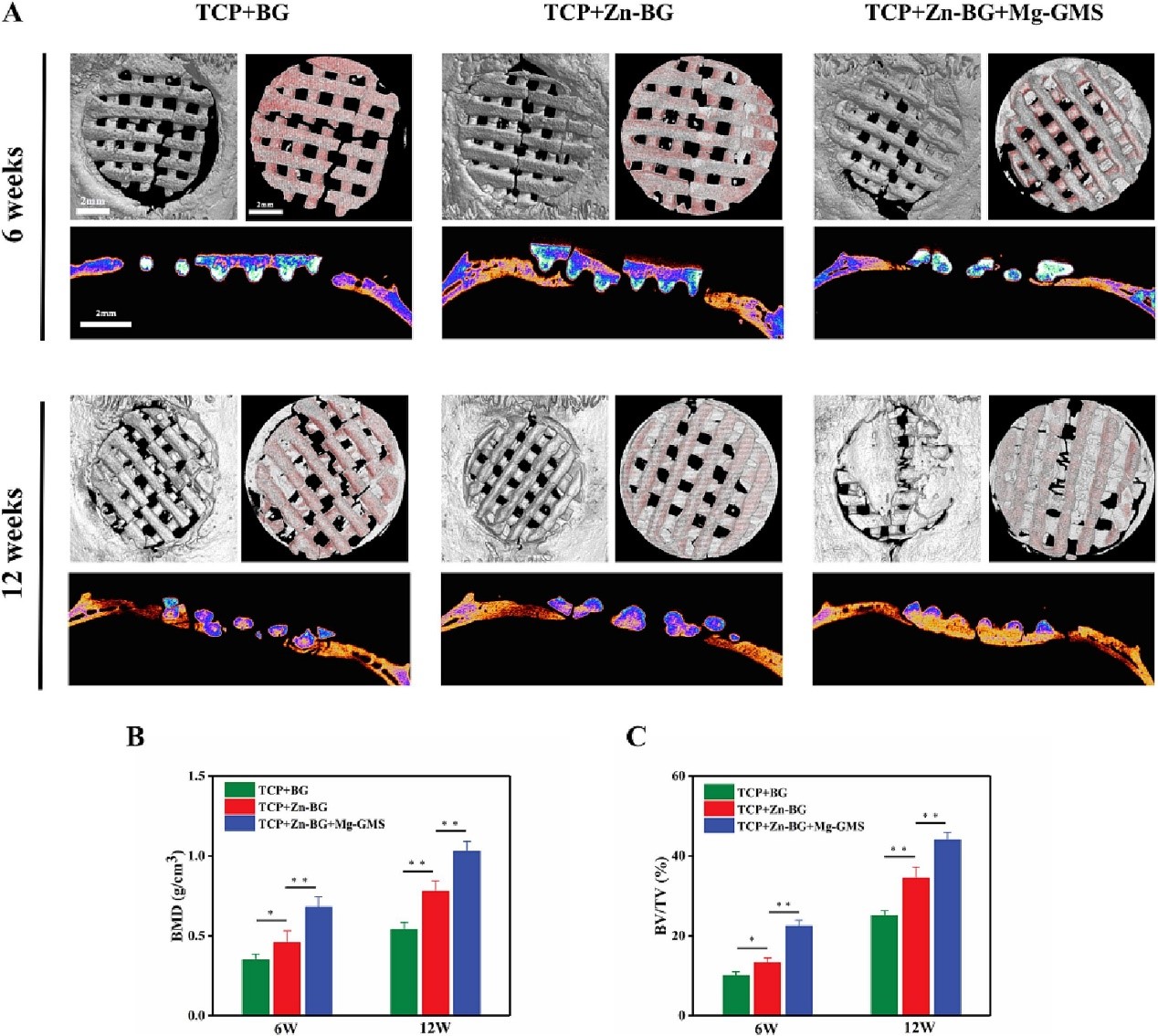 研究通過使用8毫米的大鼠顱骨大段骨缺損模型,進一步研究了復合支架在體內的骨再生能力。使用micro-CT和組織學分析評估了第6周和第12周的骨恢復情況。與TCP/BG相比,TCP/Zn-BG有更多的新骨生長,表明Zn2+的長期釋放有利于成骨,而TCP/Zn-BG/Mg-GMS在三組中對新骨生長的效果最好。新生骨組織的定量分析結果顯示,TCP/Zn-BG/Mg-GMS的新生骨的骨體積分數(BV/TV)和骨密度(BMD)顯著高于其他兩組。通過組織學分析(H&E染色和MT染色),對新生骨組織進行了評估。所有組在植入后均未觀察到明顯的炎癥反應或壞死。這些結果表明,TCP/Zn-BG/Mg-GMS中新骨組織的數量高于其他兩組,表明TCP/Zn-BG/Mg-GMS具有更快和更好的骨再生能力。此外,從H&E和MT切片中發現,TCP/Zn-BG/Mg-GMS在支架內部有更多的骨組織生長。這表明通過Mg-GMS和BG的降解形成的多級孔結構有利于骨組織向支架內部生長,也表明這種多級孔結構有利于加速材料在體內的降解行為。這為新骨組織最終替代植入材料的可能性打開了大門。此外,從MT染色切片中發現,TCP/Zn-BG/Mg-GMS中的新生血管形成顯著多于其他組,這與體外實驗結果一致,表明TCP/Zn-BG/Mg-GMS能夠促進血管化骨再生。