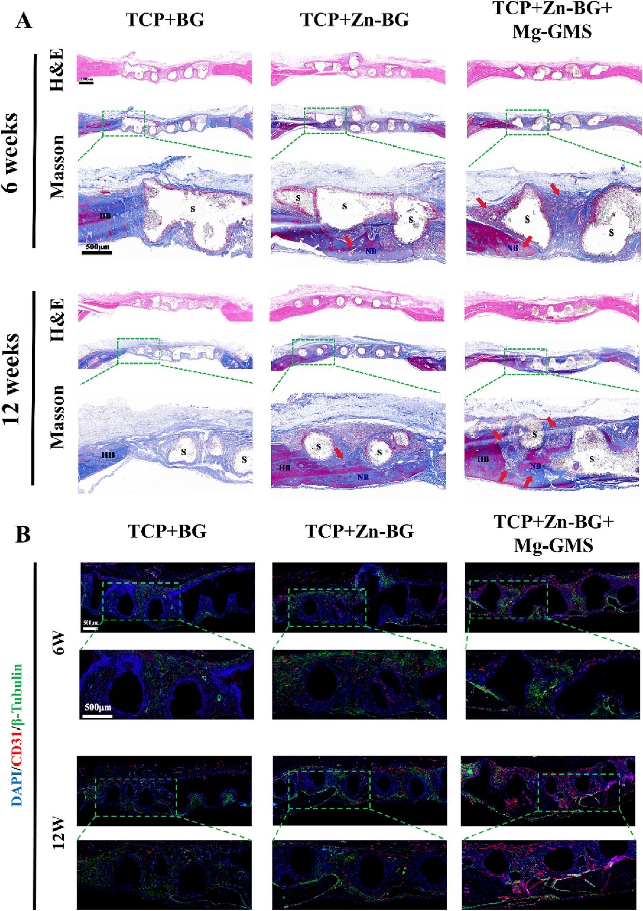 圖7. 大鼠大段骨缺損的骨再生和神經-血管化。(A)H&E和MT染色。(B)從顱骨大段缺損樣本中進行的CD31(血管,紅色)和β3-微管蛋白(神經,綠色)共染色。