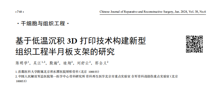 Chen Mingxue, Wu Jiang, Yin Han, Wei Xiang, Liu Shuyun, Guo Quanyi.Construction of a novel tissue engineered meniscus scaffold based on low temperature deposition three-dimenisonal printing technology.Chinese Journal of Reparative and Reconstructive Surgery, 2024, 38(6): 748-754.