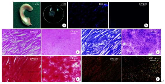圖1.半月板觀察 左側(cè)示脫細(xì)胞前,右側(cè)示脫細(xì)胞后 a.大體觀察;b. DAPI染色熒光顯微鏡觀察;c. HE染色;d.番紅O染色;e.甲苯胺藍(lán)染色;f.天狼猩紅染色