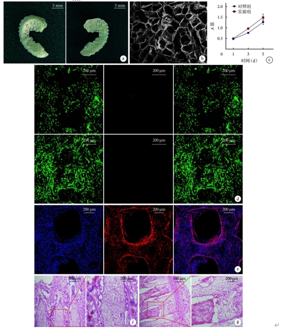 圖2. 新型組織工程半月板支架觀察 a.大體觀察;b.掃描電鏡觀察;c. CCK-8檢測細(xì)胞增殖;d.激光共聚焦顯微鏡下培養(yǎng)1天(上)及7天(下)死/活細(xì)胞染色觀察 從左至右分別為活細(xì)胞染色、死細(xì)胞染色及兩者重疊;e.激光共聚焦顯微鏡觀察培養(yǎng) 7天鬼筆環(huán)肽染色觀察;f、g.大鼠皮下植入后1、3周HE染色觀察。