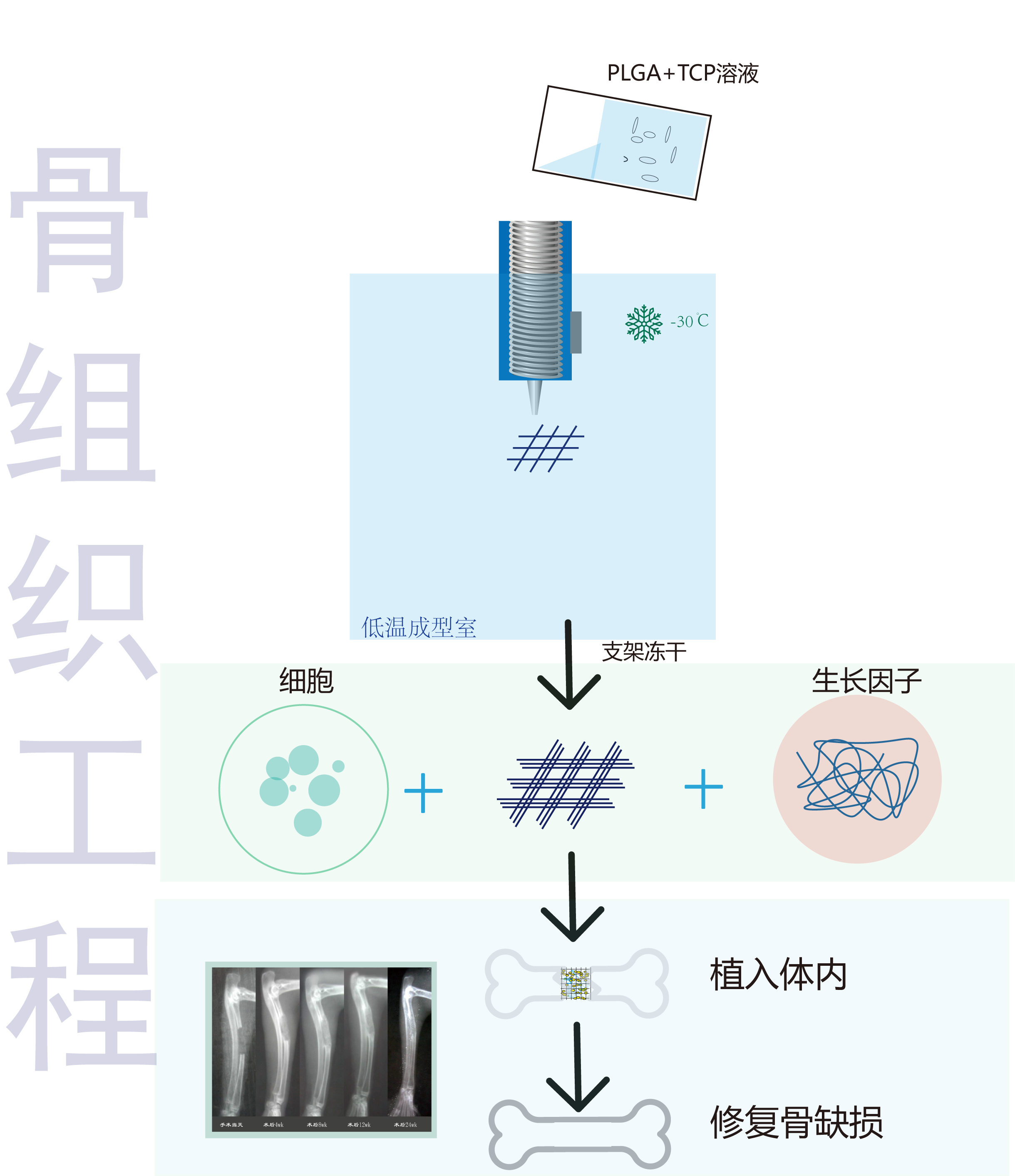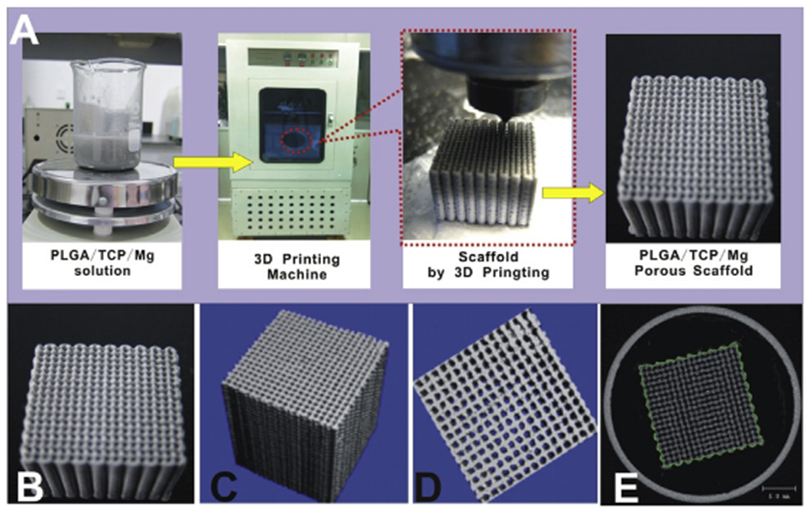 賴博士等 利用低溫沉積3D打印出PLGA/TCP/Mg體系的支架,宏觀空隙有450μm,微觀空隙在2.5-90μm之間,Mg的加入可以極大提高支架的力學(xué)性能,15%wt的Mg其力學(xué)強(qiáng)度可以達(dá)到104Mpa,而且保證良好的生物學(xué)性能可以促進(jìn)并誘導(dǎo)細(xì)胞增殖分化成骨組織。