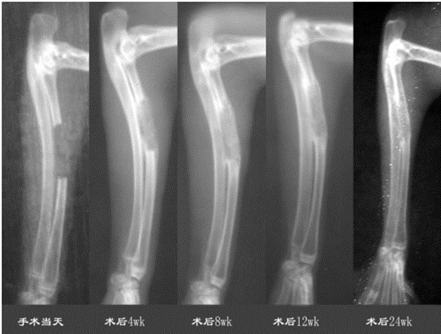 清華大學(xué)熊卓和第四軍醫(yī)大學(xué)利用PLLA/TCP復(fù)合材料,PLLA與TCP的質(zhì)量比為7:3,制造支架的開放孔隙的孔隙率為80%,大孔孔徑約為500 μm,微孔孔徑約為5 μm。支架的外形為直徑5mm、長15mm的圓柱形;生長因子為rhBMP-2。結(jié)果顯示術(shù)后4周,骨缺損區(qū)有不均勻的低密度骨痂顯影;術(shù)后8周,骨痂顯影密度增高,骨痂外層形成皮質(zhì)骨輪廓,與缺損斷端連接;術(shù)后12周,骨痂密度進(jìn)一步增高,中心區(qū)出現(xiàn)與植入支架輪廓一致的高密度區(qū),周圍皮質(zhì)骨輪廓清晰,與斷端連接良好;術(shù)后24周,骨痂塑型完好,骨痂皮質(zhì)骨與缺損兩斷端的皮質(zhì)骨完全融合成一體,骨痂中心區(qū)密度降低。